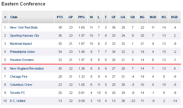Хьюстон, наконец, собравший всех лидеров на поле, укрепил свои позиции в зоне плей-офф не только благодаря собственной победе над Коламбусом, но и при непосредственной помощи Торонто, выцарапавшего три пункта у Революшн благодаря быстрому мячу Матиаса Лабы. У Динамо заправляли, как и водится, Брэд Дэвис и Уилл Брюйн, которым активно помогали фланги в лице Оскара Гарсии (голевая передача) и Джайлза Барнса (заработанный пенальти).