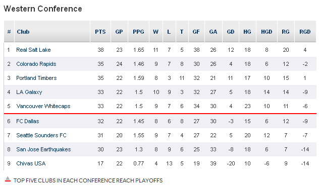 На Западе ситуация в лидирующей группе не претерпела никаких изменений. Гэлэкси на этой неделе отдыхали, а все остальные очки между собой поделили. Колорадо дважды отыгрывался по ходу матча с Реалом, Портленд скатал свою уже одиннадцатую ничью в чемпионате (правда, при всего трех поражениях, но сколько очков в этих встречах команда Калеба Портера растеряла, уму непостижимо), упустив минимальное преимущество над Ванкувером.