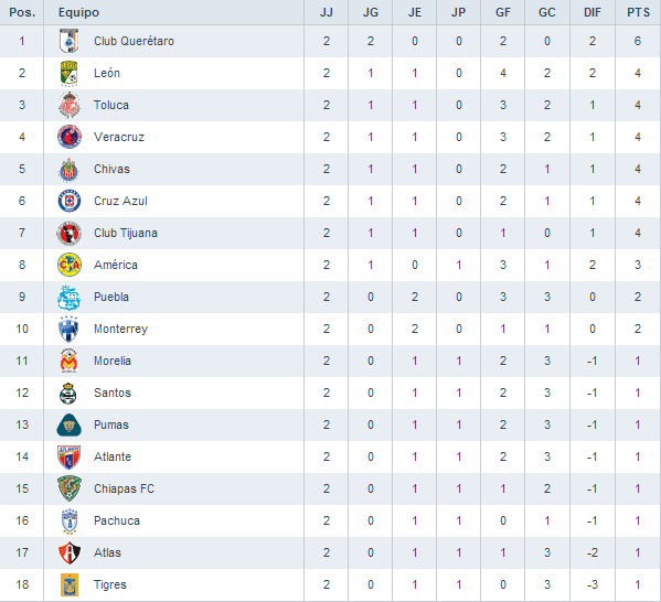 Остальные пока могут чувствовать себя более-менее спокойно, за исключением разве что Веракруса: новичок сезона пока выступает уверенно, что позволяет находиться в комфортном отдалении от зоны вылета, но из-за малого количестве игр все может измениться благодаря любой неудачной серии матчей. Однако пока Красные Акулы сбавлять обороты не собираются, что и продемонстрировали в первых матчах.