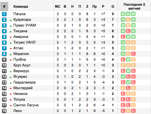 В 3-м туре чемпионата Мексики Пачука одержала 3-ю победу, а Керетаро и Пумас поднялись на 2-3 место.