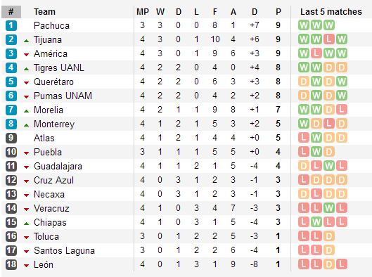 Благодаря разнице мячей продолжает лидировать Пачука, которая сегодня еще сыграет свой матч 4-го тура с Толукой. С ней поравнялись Тихуана и Америка, а в спину лидерам дышат Тиграс, Керетаро и Пумас, у которых по 8 пунктов.