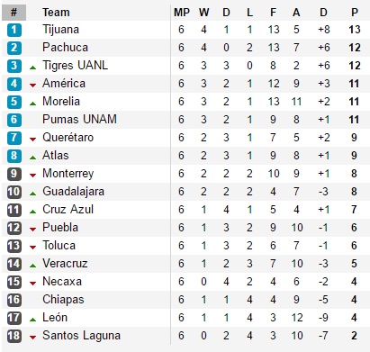 Состоялись 2 заключительных поединка 6-го тура лиги МХ — Пумас — Монтеррей и Пуэбла — Америка.