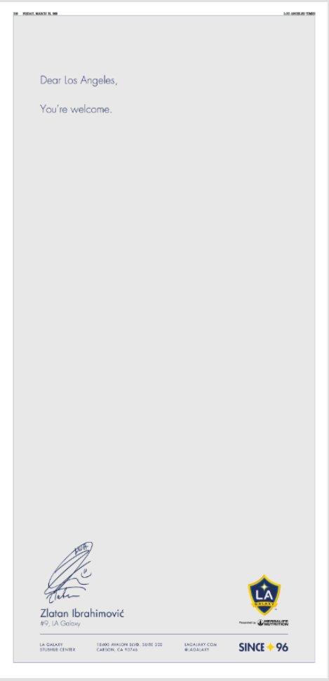 Ибрагимович позаботился, чтобы о его пришествии узнал каждый человек Лос-Анджелеса и для этого выкупил целую страницу в местной газете LA Times и поприветствовал город — "Добро пожаловать, Лос-Анджелес".