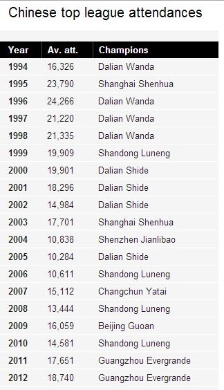 Первая профессиональная лига Китая была основана в 1994 году и средняя посещаемость игр в первых сезонах была равна 20 000 зрителям. Однако когда через 10 лет создали Супер-лигу, этот показатель уже упал вдвое. Из-за многочисленных скандалов с договорняками и коррупции в футболе многие фанаты предпочли покинуть стадионы.