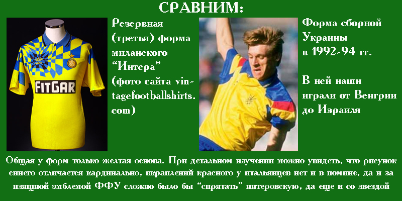 А как же с нашей сборной? Обратимся к истории. С одной стороны, посмотрим, как обстояли дела с формой у Интера. До 1990 года миланцы вообще не носили «Умбро» – сначала их одевал французский «Ле кок спортиф», затем немецкий «Ульшпорт». Лишь потом появилась «умбровская» форма, причем желтый ее комплект являлся лишь третьим – самым резервным (основная форма – традиционная черно-синяя, гостевая – белая с синими вкраплениями). Тот самый третий комплект формы Интера мы нашли – он и вправду сине-желтый, но сопоставление со снимками с ужгородского матча сразу ставит под сомнение этот миф. У Интера на плечах некие синие геометрические фигуры, рисунок не целостный, в то время как сборная Украины вышла на свой первый матч в форме с желтой основой и синими плечами с красными вкраплениями. К тому же, изучая немногочисленные фото с премьеры, видим, что рисунок на украинской форме совершенно иной. Это фасон «Умбро» 1992 года, такая текстура футболок английского производителя была популярной, но у Интера («увы» или «ура») она иная. Приглядываясь к футболкам украинцев, видим, что герб ФФУ набит без подкладки – то есть, скорее всего, он нашит не на некий скрытый элемент (та самая гипотетическая эмблема Интера), а непосредственно на желтую ткань футболки.
