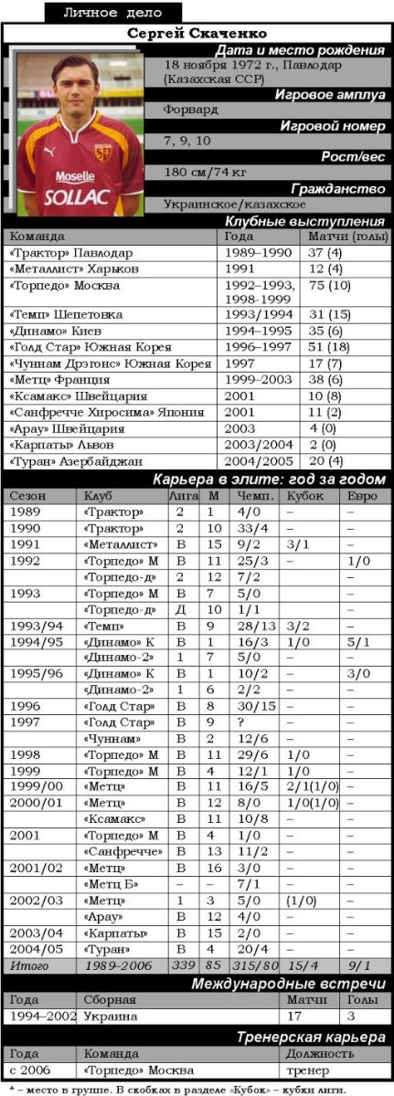 форвардов – Коновалова и Гусина (кто знает, если бы тогда все срослось, получился бы из Андрея великий центрхав?). Рекламу футбольной Украине сделала и удачная игра Скаченко, который сразу же пришелся ко двору в Сеуле. Летом 1997 года Чуннам Дрэгонс, в свое время отказавшиеся от Скаченко, попросили его у сеульцев в аренду: Голдстар ходил в аутсайдерах К-Лиги, а Драконы всерьез рассчитывали на медали. Сергей забивал и там, но в итоге Чуннам довольствовался лишь серебром. Зато команда выиграла Кубок корейской футбольной ассоциации, и здесь три гола украинца (два – в тяжелейшем полуфинале) пришлись как нельзя кстати.