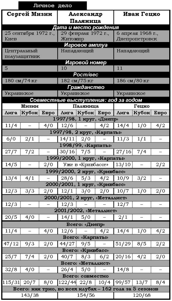 Sic transit gloria mundi, так заканчивалась сага о трио игроков, приносящих каждому новому клубу славу, титулы и путевку в Европу. Паляница еще сезон провел в Харькове, доигрывал в сумском Спартаке, забив за последние 3 с половиной сезона всего 13 мячей, но зато записав на свой счет вожделенный 100-й гол за карьеру. Мизин играл дольше всех, в составе Карпат и Арсенала был хорош и результативен. Повесил бутсы на гвоздь, имея 106 голов и состоя в клубах Гусейнова, Блохина и Чижевского. Один из самых уважаемых отечественных футболистов, он единственный из троицы сейчас занимается футболом – возглавляет перволиговый ахтырский Нафтовик-Укрнафта. Гецко и Паляница имеют нефутбольный бизнес, живут в городах, ставших родными – Одессе и Житомире.