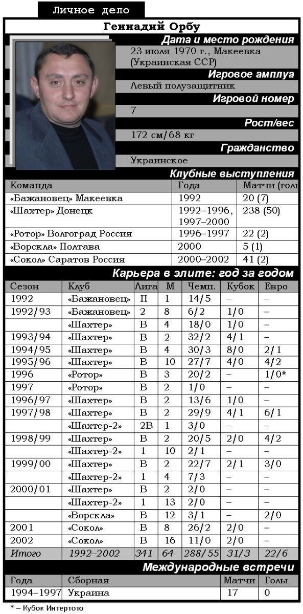 В первом же сезоне с волгоградцами Орбу заработал бронзовую медаль чемпионата России, а в следующем мог бы замахнуться и на серебро. Но весной 1997-го его позвали обратно в Шахтер, и Геннадий не упустил возможности воссоединиться с давними друзьями под руководством Яремченко. Он отыграл первый матч сезона в России против новороссийского Черноморца, а уже через два дня из Волгограда примчался в Донецк и оказался в стартующем в весенней части чемпионата Шахтере. На следующий день он махнул в Киев и попал в заявку дончан, всего через два часа отыграв полный матч против ЦСКА. Всего за полгода Орбу забьет 6 мячей, а в кубке проведет всего один матч, но какой! Финальный! В конце мая дончане обыграли Днепр, и фартовый Гена во второй раз поднял над головой Кубок Украины. Да, возвращение можно было признать удачным.