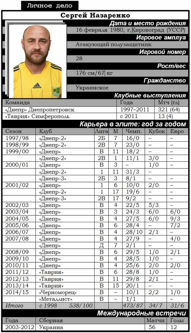 В целом, несмотря на печальное завершение истории Таврии, Сергей может заносить себе в актив три сезона в Крыму. Именно здесь он доказал всем, что может быть успешен и за пределами родного Днепра. А заодно – продемонстрировал, что человеку не стоит заглядывать в паспорт. В конце концов, именно удачными выступлениями в составе симферопольцев Назаренко заработал путевку на Евро и – позже – приглашение в Черноморец.