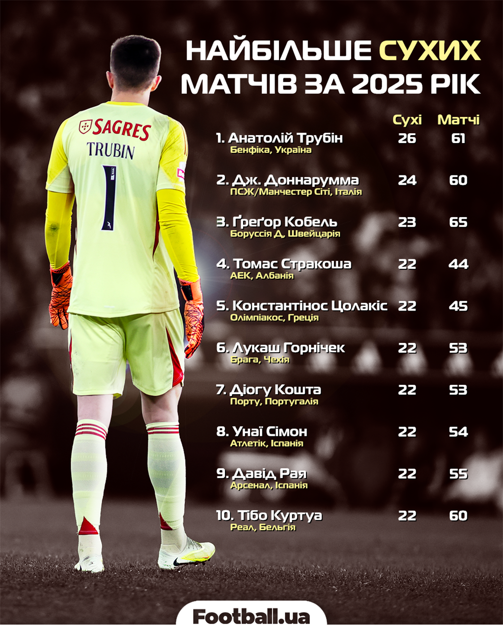 Варто відзначити, що найближчий переслідувач українця, Джанлуїджі Доннарумма, який влітку 2025 року став частиною гучного трансферу з ПСЖ до Манчестер Сіті, відстав від Анатолія на два сухі поєдинки. Легендарний Тібо Куртуа та основний воротар збірної Іспанії Унаї Сімон також опинилися нижче в рейтингу, маючи по 22 безгольові зустрічі.