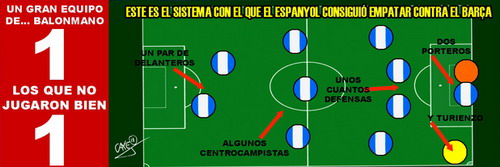 В Дерби Барселонес Эспаньол отвесил звонкую оплеуху лучшему клубу мира, отняв у Барсы победу за пять минут до финального свистка. На следующий день защитник Попугаев Рауль Родригес признался, что мяч попал ему в руку; впрочем, каталонские издания к тому времени уже расчехлили оружие и приступили к методичному уничтожению репутации арбитра Туриенсо Альвареса, который не увидел то, что видела вся планета.