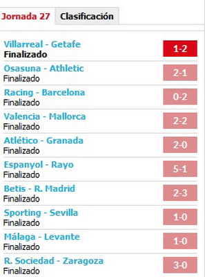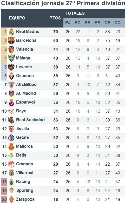 Мадрид и Барселона дружно выиграли – снова заметим, что судейство в обоих матчах с участием лидеров было отвратительным, - таким образом, между ними сохранилась десятиочковая дистанция. Пепе Мель, энтренадор Бетиса, принимавшего Сливочных, заявил, что его команда зажала Мадрид в угол. Бетикос действительно выложились наизнанку, больше владели мячом, и могут быть недовольны парочкой решений двух главных арбитров (во втором тайме травмированного судью Итурральде Гонсалеса заменил его коллега по цеху, никогда не судивший поединки выше третьего испанского дивизиона).