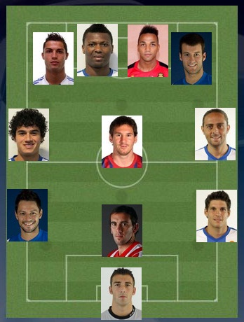 Центральный полузащитник. Месси (Барселона, 11). Забил два гола, хотя мог бы уходить с поля и с хет-триком. Смещался назад, а впереди старался действовать по всему фронту атаки. С такими бомбардирскими темпами уже в этом году перегонит Сесара и в 24 (!!!) года станет максимальным голеадором в истории Барселоны.