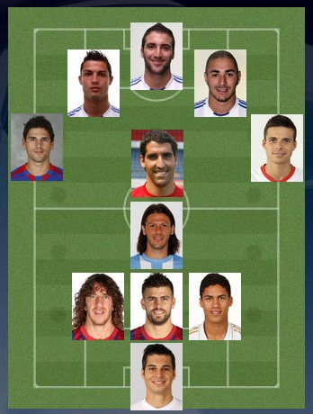 Нападающий. Бензема (Реал Мадрид, 4).Два забитых мяча и одна голевая передача. Часто смещался на правый фланг, а оба противостоящих ему футболиста Сосьедада, де ла Белья и Микель Гонсалес закончили матч с желтыми карточками и низкими оценками. В столице Испании он тяжело начинал (8 мячей в Примере и слухи о продаже после дебютного сезона), но нынешняя форма Карима Бензема позволяет говорить о нем как об одном из лучших артильеро своего поколения.