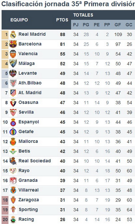 Тем временем, Мальорка оформила спасение (при этом, Киноварь от зоны Лиги Европы отделяет только 5 очков), в тяжелейшем матче переиграв героического, но практически безнадежного бойца Сарагосу. А уже через неделю мы, видимо, узнаем имя первого неудачника сезона: у Расинга не осталось ни сил, ни шансов. Хихон и Сарагоса по-прежнему продолжают борьбу, пытаясь достать получившую множество пробоин, но все еще не затонувшую Желтую подводную лодку.