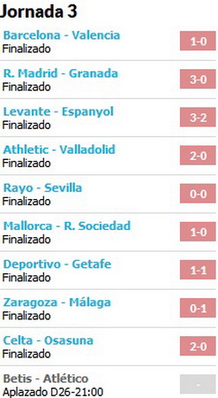 3 – Хемед (Мальорка), Хорхе Молина (Бетис), Игуаин (Реал Мадрид), Фалькао (Атлетико, 1 с пенальти)