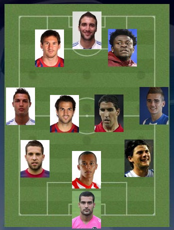 Правый полузащитник. ГРИЗМАНН (Сосьедад, 1).Любимец всех девочек Сан-Себастьяна, достигших пубертатного периода, стал героем вынесенного на понедельник матча Вальядолид – Сосьедад. Действовавший не на своем месте (слева у басков играл уругвайский полузащитник Чори Кастро, привязанный к флангу и не имеющий универсальных навыков), «Гремлин», тем не менее, не ударил в грязь лицом, пополнив голевой актив двумя забитыми мячами. На 21-летнего вингера облизываются многие большие клубы, но директорат клуба из провинции Гипускоа в августе сумел продлить контракт с талантливым футболистом до 2016 года, значительно улучшив гонорарные условия сделки.