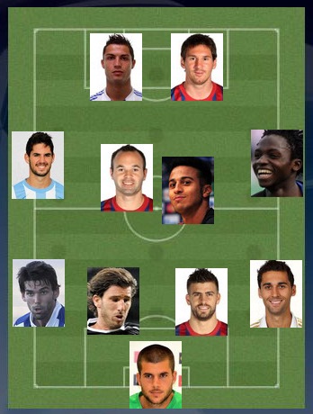 5 – Виктор Родригес (Сарагоса), Валерон (Депортиво), Беньят (Бетис), Бензема, Ди Мария (оба – Реал Мадрид), Тино Коста (Валенсия), Мичел (Леванте), Чори Домингес (Райо Вальекано), Арда Туран (Атлетико), Хави, Хорди Альба (оба – Барселона)