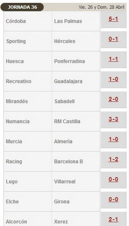 Вильярреал и Альмерия, висящие на хвосте у тройки лидеров, на этот раз потеряли очки. Желтая подводная лодка ставила на дальние выстрелы в исполнении Кани и Маркоса Сенна, но этого оказалось мало для победы над Луго, традиционно умирающим дома в матче против любого, даже самого сильного соперника. Альмерия же пропустила гол в раздевалку на 43-й минуте в игре против Мурсии (красивый выстрел на счету Кике Гарсии), и в дальнейшем была гораздо ближе к счету 0:2, чем к ничейному результату.