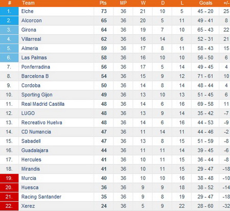 В центральном поединке тура Эльче принимал каталонскую Жирону, впервые в своей истории могущую пробиться в Примеру. Плохое состояние поля на Мартинес Валеро и беспрерывный дождь помешали командам продемонстрировать лучшие качества в своем арсенале. В первом тайме преимущество имели хозяева, но во второй половине встречи Жирона врубила скорость и имела все шансы для того, чтобы увезти от аликантийцев три очка. Итоговые 0:0 – и на второе место в турнирной таблице выходит Алькоркон, взявший тяжелые три очка в противостоянии с Хересом, который вроде как записной аутсайдер, но, с другой стороны, просто так не сдается никому.