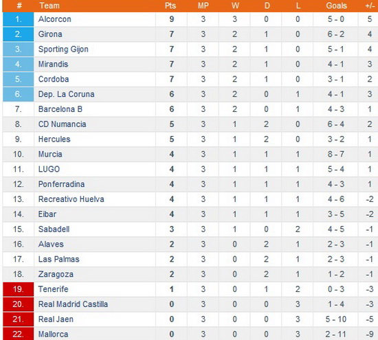 Единоличным лидером дивизиона после третьего тура впервые в своей истории стал вечный (в последнее время) нарушитель спокойствия Алькоркон. Желтая лихорадка дома тремя безответными мячами разбомбила самый старый футбольный клуб Испании – Рекреативо. Причем надо отметить, что голкипер Алькоркона Дани Хименес, перешедший в межсезонье из Райо Вальекано, пока еще не пропустил в этом сезоне ни одного мяча.