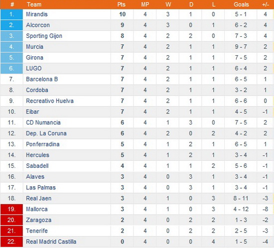 По первым турам можно отметить, что в дивизионе пока нет команды, на которую можно было бы ткнуть пальцем и без зазрения совести сказать, что в июне она точно пополнит Примеру. Мирандес, Алькоркон и Хихон, возглавляющие пелотон, хороши, но по-своему, не до безусловности, не без огрехов. Коллективы же, только вылетевшие из «вышки», пока хочется только обнять и плакать – и не вспомнишь ведь, когда экс-примерцы настолько бесславно начинали свой старт: Депор двенадцатый, а Мальорка с Сарагосой и вовсе в зоне вылета.