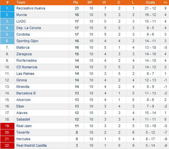 Кастилья остается на последнем месте в классификации – в отчетном туре младшие Галактикос уступили в гостях Мальорке со счетом 0:2. Вообще, Мальорка должна была выигрывать крупно, причем, еще в первом тайме, но ей все время чего-то не хватало. Что же касается парней Альберто Ториля, то они провели просто ужасающий матч, уступив сопернику во всех компонентах игры.