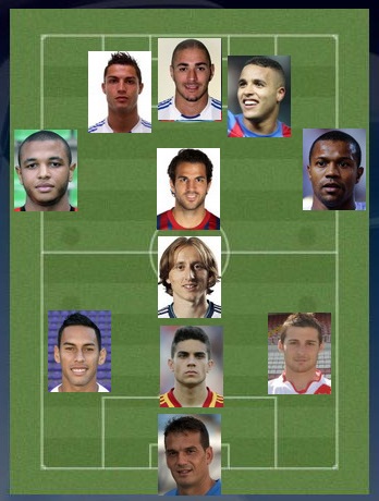 3 – Банега (Валенсия), Серхио Гарсия (Эспаньол), Габи, Филипе Луис, Вилья (все – Атлетико), Сарабиа, Педро Леон, Диего Кастро (все – Хетафе), Джовани дос Сантос, Хонатан Перейра (оба – Вильярреал), Беньят (Атлетик), Вела (Сосьедад), Криштиану Роналду (Реал Мадрид), Ракитич (Севилья)