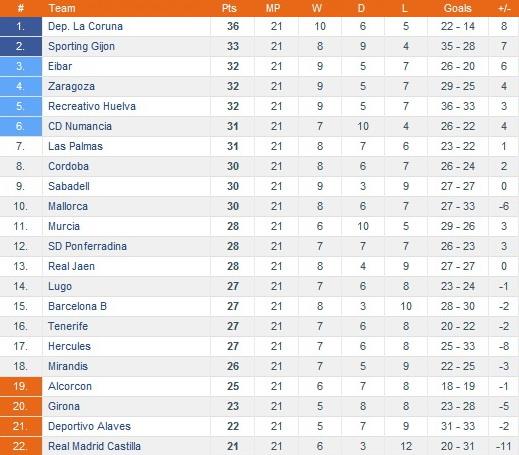 1 – Кордоба, Алавес, Нумансия, Эркулес, Эйбар, Мирандес, Лас-Пальмас, Рекреативо, Понферрадина, Кастилья, Мурсия, Сарагоса, Сабадель, Хаэн