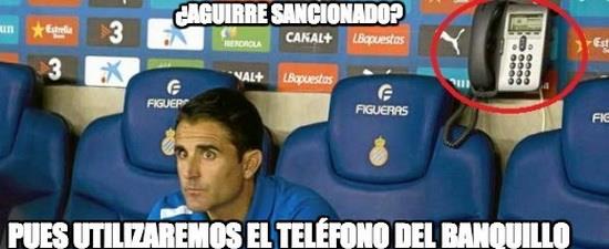 Банкилья Эспаньола перед матчем против Мадрида оснащена телефонным аппаратом, дабы дисквалифицированный тренер Попугаев Хавьер Агирре мог давать указания на расстоянии.