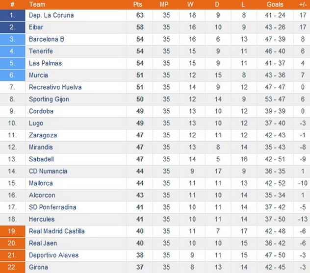 1 – Алавес, Нумансия, Эркулес, Эйбар, Рекреативо, Понферрадина, Мурсия, Сарагоса, Мальорка, Луго