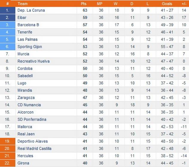 1 – Алавес, Нумансия, Эркулес, Эйбар, Рекреативо, Понферрадина, Мурсия, Сарагоса, Мальорка, Луго