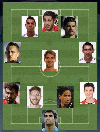 3 – Модрич, Карвахаль, Ильярраменди (все – Реал Мадрид), Мусаккио, Уче, Джовани дос Сантос, Асенхо (все – Вильярреал), Сан Хосе, Гурпеги, Итурраспе, Сусаета, Ираола (все – Атлетик), Фегули (Валенсия), Рауль Гарсия, Габи, Хуанфран, Миранда (все – Атлетико), Кабальеро (Малага), Эль-Араби (Гранада), Бакка (Севилья), Эстебан (Альмерия), Пике, Бускетс (оба – Барселона), Орельяна, Нолито (оба – Сельта), Ларривей (Райо Вальекано)