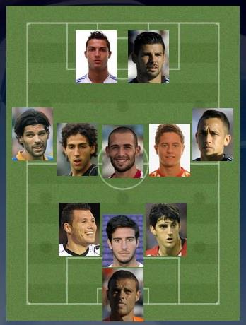 3 – Модрич, Карвахаль, Ильярраменди (все – Реал Мадрид), Мусаккио, Уче, Джовани дос Сантос, Асенхо (все – Вильярреал), Гурпеги, Итурраспе, Сусаета, Ираола (все – Атлетик), Фегули (Валенсия), Рауль Гарсия, Габи, Хуанфран, Миранда (все – Атлетико), Кабальеро (Малага), Эль-Араби (Гранада), Бакка (Севилья), Эстебан (Альмерия), Пике, Бускетс (оба – Барселона), Ларривей (Райо Вальекано)