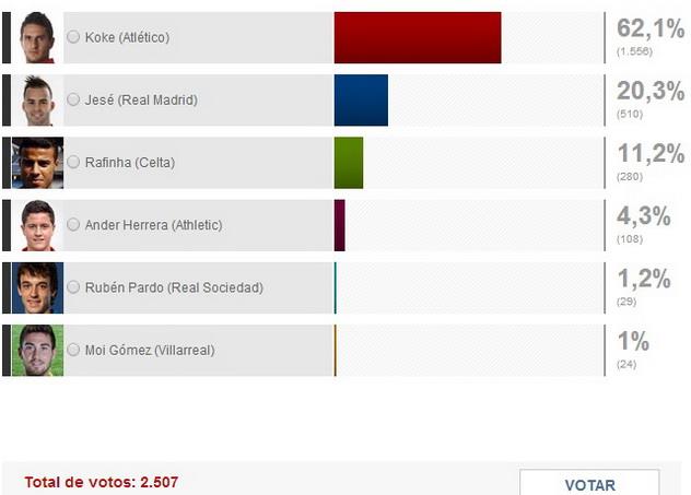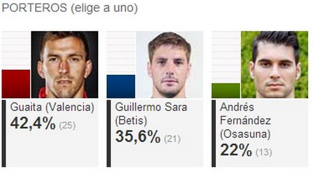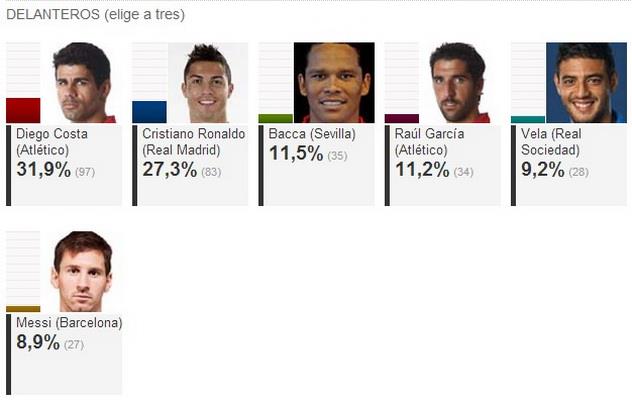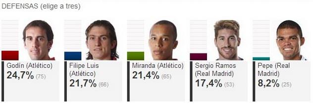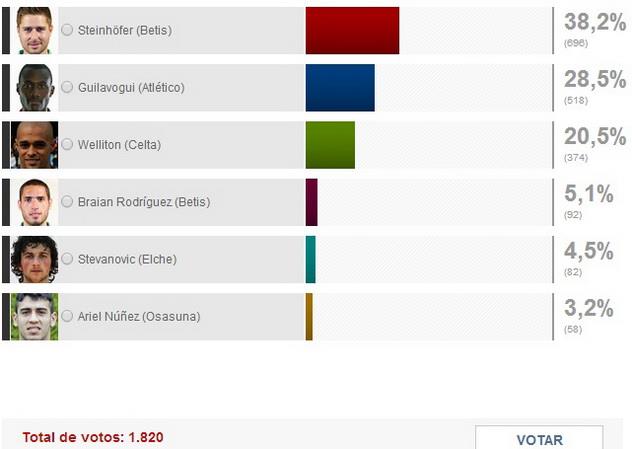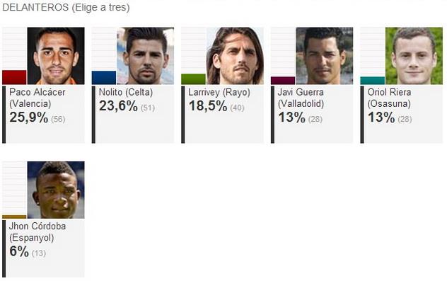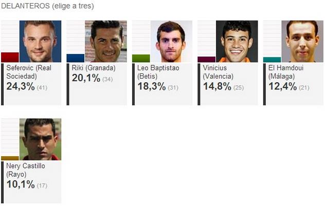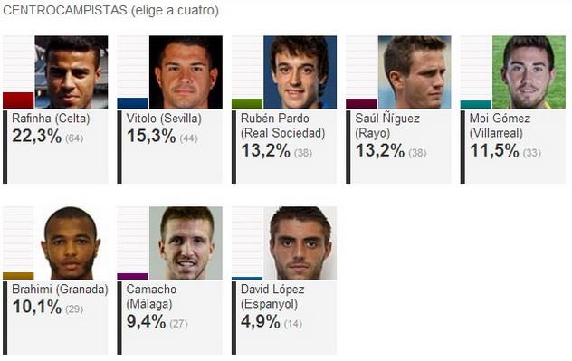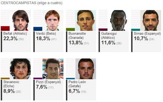 3 – Модрич, Карвахаль (оба – Реал Мадрид), Уче, Асенхо (оба – Вильярреал), Гурпеги, Итурраспе, Сусаета, Ираола (все – Атлетик), Рауль Гарсия, Габи, Хуанфран, Миранда (все – Атлетико), Кабальеро (Малага), Эль-Араби (Гранада), Бакка (Севилья), Эстебан (Альмерия), Пике, Бускетс (оба – Барселона), Ларривей (Райо Вальекано), Давид Наварро (Леванте), Начо Камачо (Малага)