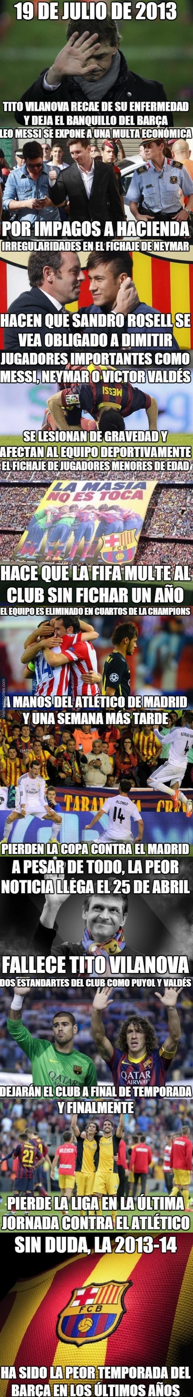 А еще Атлетико победил вопреки: ситуация в турнирной таблице развивалась таким образом, что каталонцы могли чемпионами, если бы просто выиграли в последнем матче национального первенства (насчет заслуженно или незаслуженно можно и поспорить, блаугранас 22 тура в нынешнем сезоне находились на первой строчке Примеры); тут еще Диего Коста и Арда Туран, пара важнейших механизмов в структуре Диего Симеоне не вовремя получили травмы, но все это не сломило победный дух Матрасников. Гол Диего Година, — когда хозяева в очередной раз дали комфортно пробить из собственной штрафной, и, естественно, пропустили, — окрасил герб рохибланкос в чемпионские золотые тона.