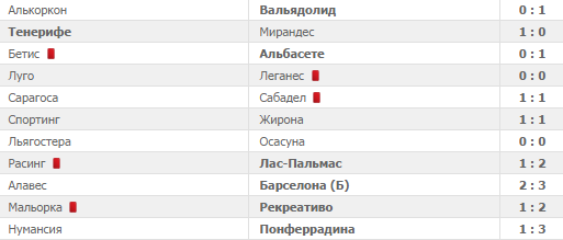 Сантандерский Расинг ныне постигли тяжелые времена: с вылетом в Сегунду проблемы их не покинули, а ситуация только усугубляется. Сейчас подопечные Пако Фернандеса плетутся на последнем месте, не добыв с начала темпорады ни одного пункта. В гости к ним приехал Лас-Пальмас, который набрал неплохую форму. Но развитие событий встречи были совсем не такими, как предполагали многие эксперты. Хозяева усилиями Мигелеса вышли вперед, но вскоре и вовсе могли удваивать преимущество. Центральный защитник Горцев Хави Сория, подключившись к атаке, не смог с центра чужой штрафной замкнуть опасный прострел с фланга. Позже из потенциального героя он превратился в антигероя, получив тархету роху за грубый подкат против соперника. Этим он сильно подвел команду, ведь она лишилась не только победы, но и ничьи. Под занавес поединка отличился Серхио Араужо, чем укрепился в гонке за Трофео Пичичи, а Анхель Лопес и вовсе принес викторию, которая помогла тем выйти на первое место (пусть и не единолично).