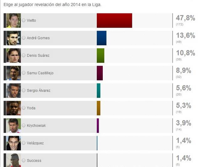 5 – Иско, Хамес Родригес (оба – Реал Мадрид), Нолито (Сельта), Луис Суарес (Барселона), Пьятти (Валенсия), Габи (Атлетико)