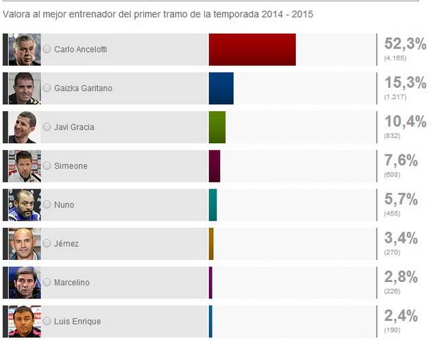 3 – Бензема, Карвахаль (оба – Реал Мадрид), Лео Баптистао (Райо Вальекано), Неймар, Ракитич (оба – Барселона), Альбентоса (Эйбар), Камени (Малага), Пьятти, Дани Парехо (оба – Валенсия), Гризманн (Атлетико)