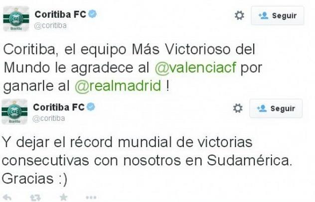 После победы над Мадридом первое поздравление Валенсия получила от Коритибы, обладателя мирового рекорда по количеству побед подряд (24).