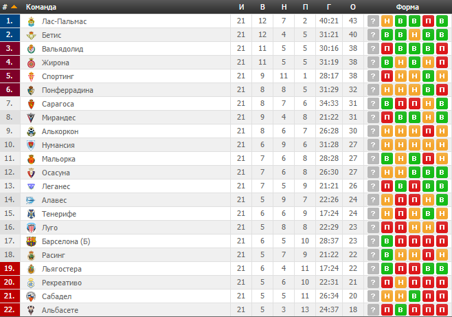 Таким образом, Лас Пальмас остается на первой строчке в турнирной таблице, но теперь расстояние от второго места составляет лишь три очка.