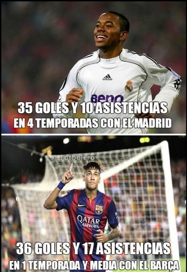Сравните статистику Робиньо за 4 сезона в Мадриде с показателями Неймара за полтора года в Барселоне.