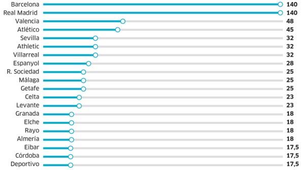 Новый контракт, как уже говорилось выше, начнет действовать с сезона 2016/17, в то время как стоимость общего пула перешагнет отметку в один миллиард евро. Пожалуй, не стоит лишний раз подчеркивать, что такие цифры для Испании совершенно невообразимые. Да, можно добавить, что во времена трансляций Mediapro за восемь лет два гранда в общей сложности на каждого получали 1,1 миллиард евро, но ведь тогда было неравномерное распределение телевизионных доходов.