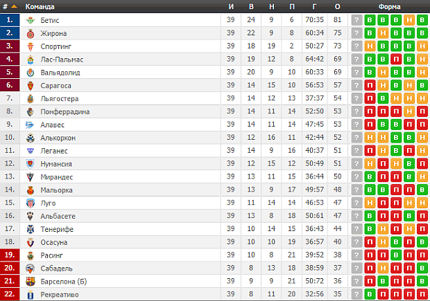 Сейчас Вальядолид идет вровень с Лас Пальмасом, а Барса Б продолжает занимать предпоследнюю позицию.