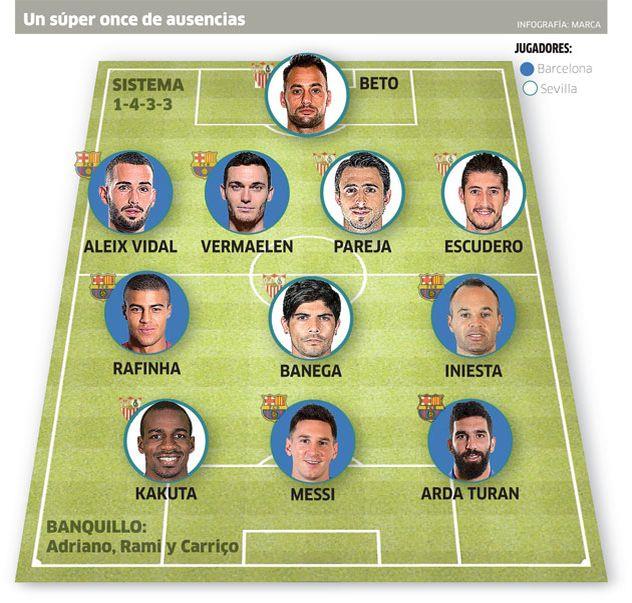 Камара, Дуглас, Гумбау – уже сидят на скамейке запасных Барселоны. Луис Энрике, проигрывая Севилье 0:2 сделал лишь две замены, одна из которых – правый защитник вместо центрального. У Севильи тоже было достаточно потерь, особенно в обороне, но отсутствие Иньесты и Месси всё же ощутимее, согласитесь.