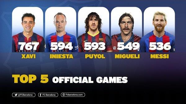 Рекорд принадлежит бывшему полузащитнику команды Хави (767 матчей). На счету Андреса Иньесты 594 игр, Карлеса Пуйоля – 593, Мигели — 549.