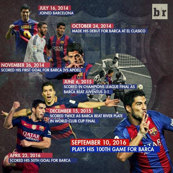 Форвард Барселоны Луис Суарес преодолел провел сотню матчей за клуб.
