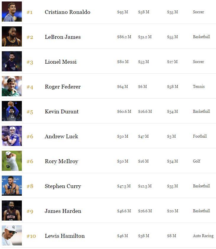 Доходы португальца за 2017 год составили 93 миллиона долларов и с этой суммой он возглавил рейтинг. На 6,8 миллиона меньше у баскетболиста ЛеБрона Джеймса. Месси отстал от португальца на 13 миллионов долларов — третье место.