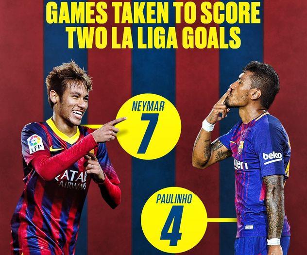 4 — Неймару понадобилось 7 матчей, чтобы забить 2 гола за Барселону, а Паулиньо — 4.