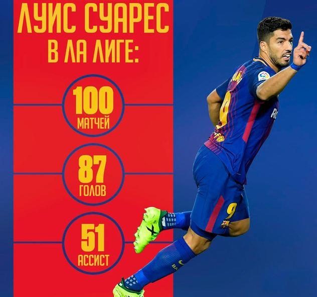 100 — Луис Суарес провел 100-й матч за Барселону в чемпионате Испании (87 голов, 43 передачи).